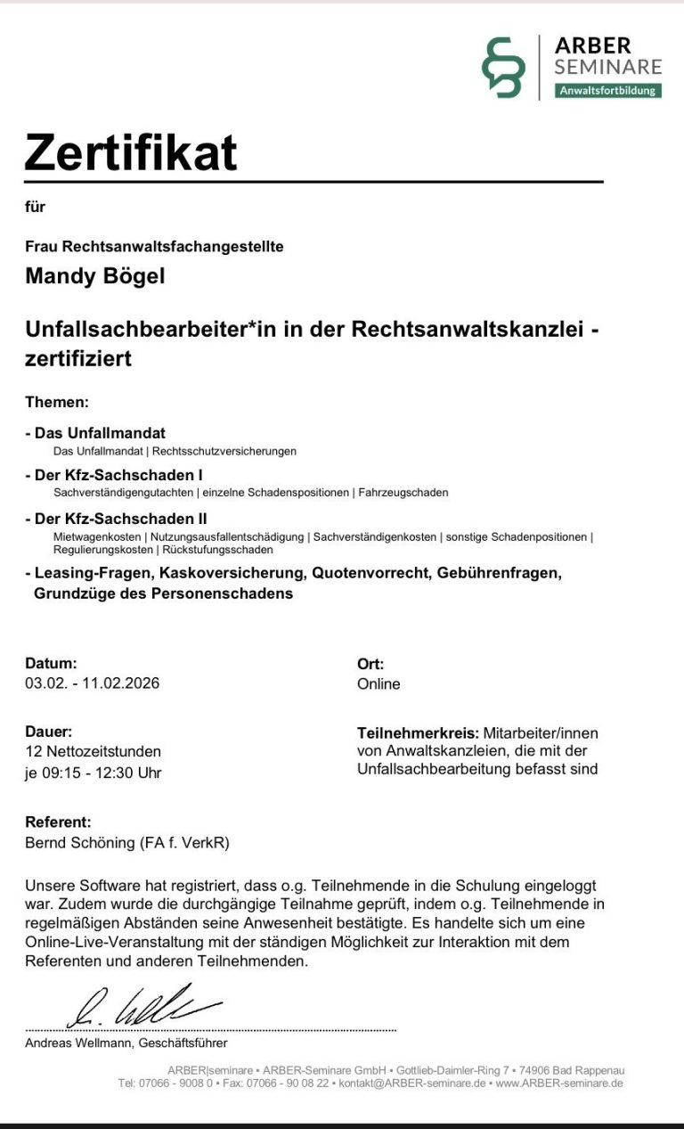 Im Februar 2026 habe ich erfolgreich die Weiterbildung zur zertifizierten Unfallsachbearbeiterin in der Rechtsanwaltskanzlei bei ARBER Seminare abgeschlossen.