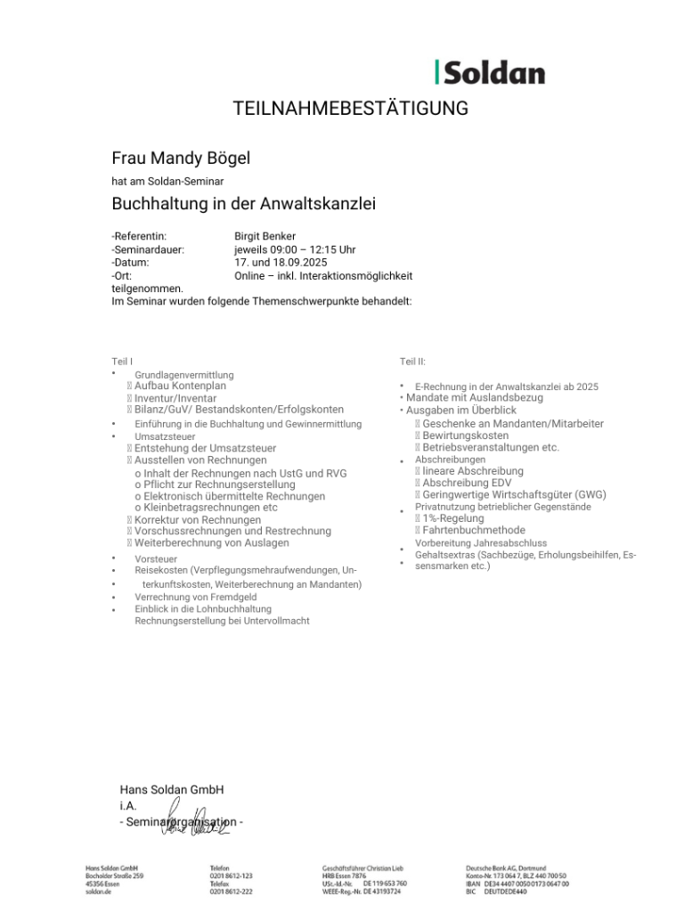 Zusätzlich wurden Themen wie elektronische Rechnungen, Auslagen- und Vorschussabrechnungen, Kostenarten, Abschreibungen und die E-Rechnung in der Anwaltskanzlei behandelt.