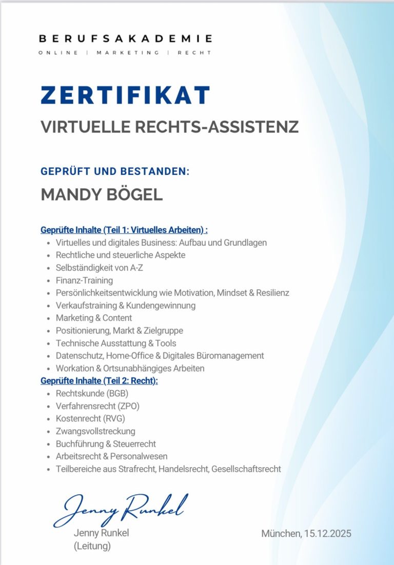 Erfolgreich abgeschlossene Weiterbildung zur Virtuellen Rechtsassistenz mit geprüften Inhalten im Bereich virtuelles Arbeiten sowie rechtliche Grundlagen.