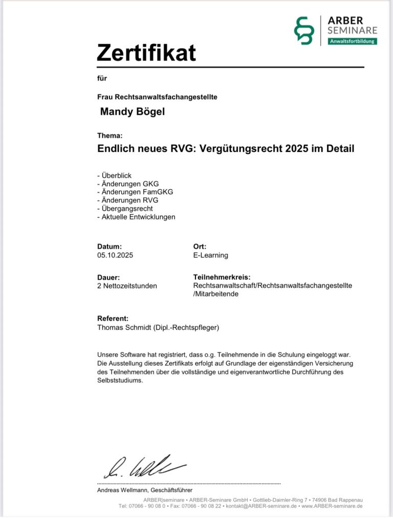 Teilnahme an einer Fortbildung zum Vergütungsrecht 2025 mit Überblick über die aktuellen Änderungen im Kosten- und Gebührenrecht.