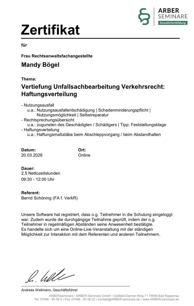 Im Februar 2026 habe ich erfolgreich die Weiterbildung zur zertifizierten Unfallsachbearbeiterin in der Rechtsanwaltskanzlei bei ARBER Seminare abgeschlossen.